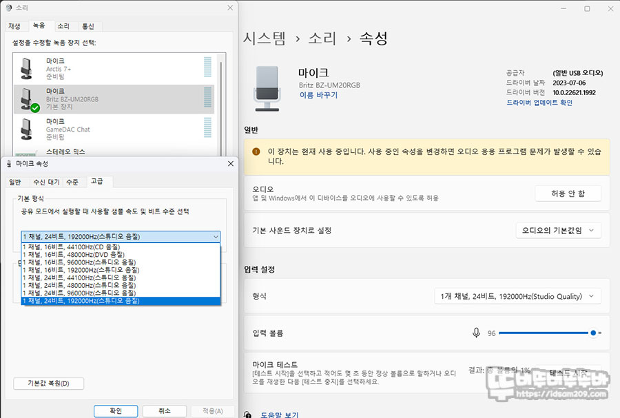 USB 연결 시 인식되는 마이크 속성을 살펴보면 16비트 192kHz, 24비트 192kHz의 고품질 성능을 지원하기에 활용도가 좋은 편입니다.