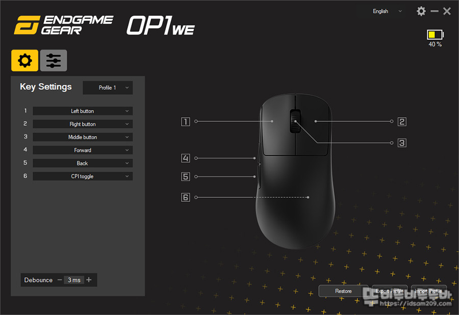 버튼 메뉴에서는 4개의 프로파일 선택, 다양한 버튼 기능 그리고 0~ 30ms 설정이 가능한 디바운스 타임을 지원하며 상황에 따라 키 콤비네이션을 이용한 단축키 또는 멀티미디어 기능과 폴링 레이트, 프로파일 스위칭 기능을 활용하시면 좋습니다.