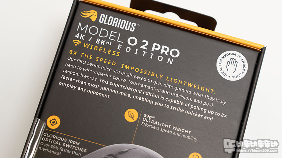 글로리어스 MODEL O 2 PRO 8K EDITION 패키지에서는 4K/8K 지원, 2.4GHz 무선, 59g 무게 등 제품의 특징을 포인트로 강조하고 있습니다.
