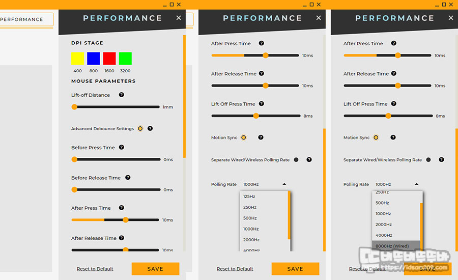 퍼포먼스 메뉴는 DPI 설정과 BAMF 2.0 센서를 사용하여 최다 26,000dpi 및 모션싱크 외 다양한 디바운스 딜레이를 조절하는 기능이 업데이트되었네요.