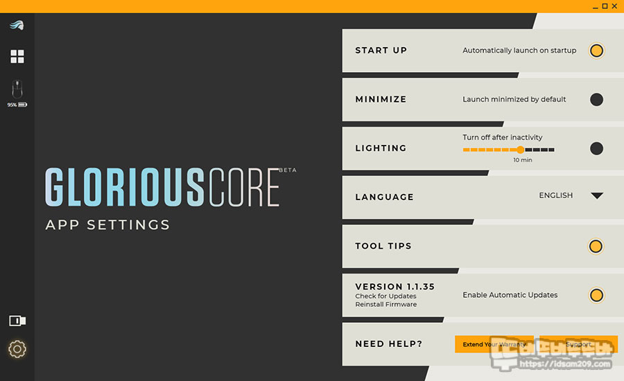 글로리어스 게이밍 기어가 연결되어 있을 때 연결된 제품을 보여주는 대시보드에서는 배터리 잔량을 확인할 수 있으며 연결된 기기를 선택하면 세부 설정 메뉴로 진입하게 됩니다.
