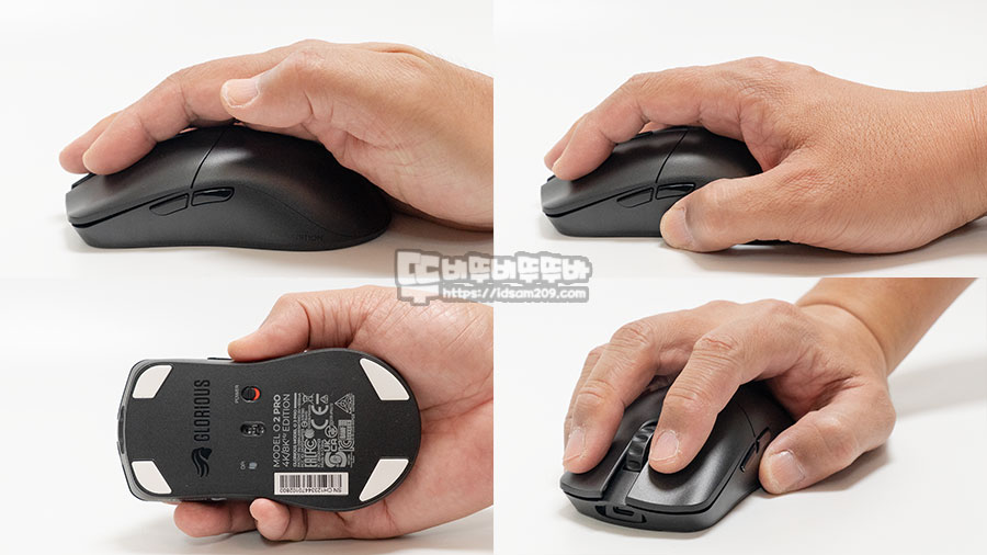 마우스 길이가 112mm 대칭형 왼손잡이 마우스 디자인이기에 마우스 그립 시 상단기 크게 느껴지는데 손 크기에 따라 차이가 있겠지만 대체로 마우스를 감싸는 형태의 팜 그립과, 클로 그립이 최적의 그립으로 보입니다.