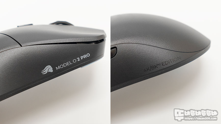 마우스 좌우 측면에 인쇄된 제품의 모델명과 4K/8K 에디션 문구 모습.