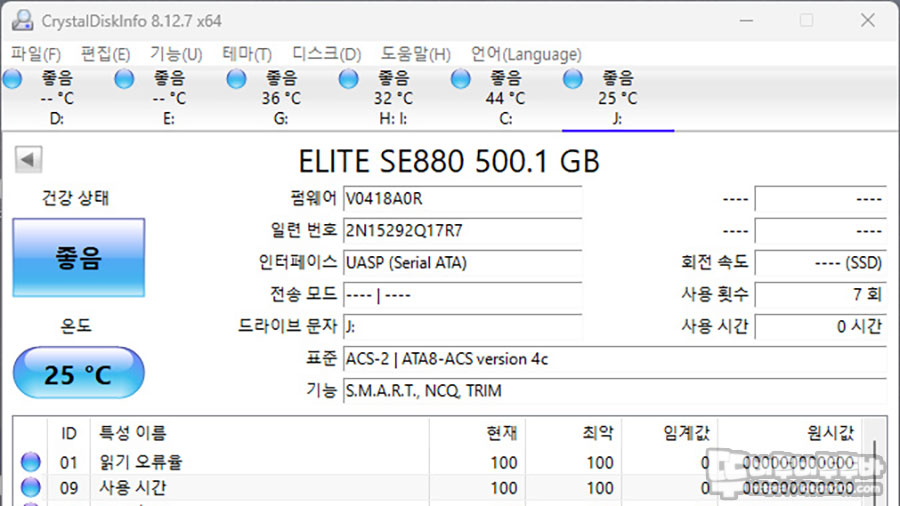 먼저 CrystalDiskInfo로 외장 SSD에 사용된 SSD 정보를 확인해 보면 UASP 인터페이스에 SATA 방식의 SSD가 사용된 것으로 표현되는 SATA 방식이 이런 속도가 나올 수 있나? 싶네요.