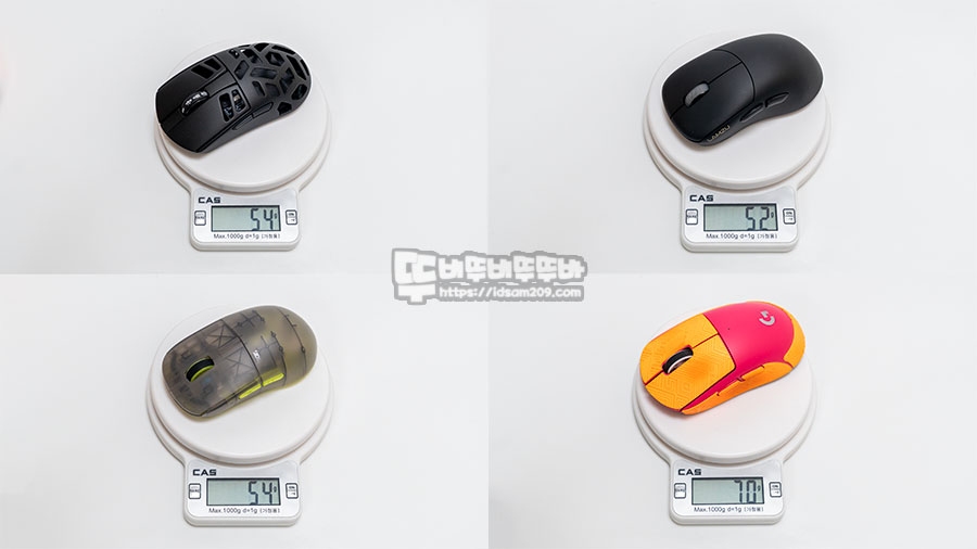 먼저 무게를 비교해 보면 DAREU A950G MG 54g, Pulsar X2H [Acid Rewind 에디션] 54g, LAMZU THORN 52g, 로지텍 G Pro X Superlight 70g으로 확인되는데요.