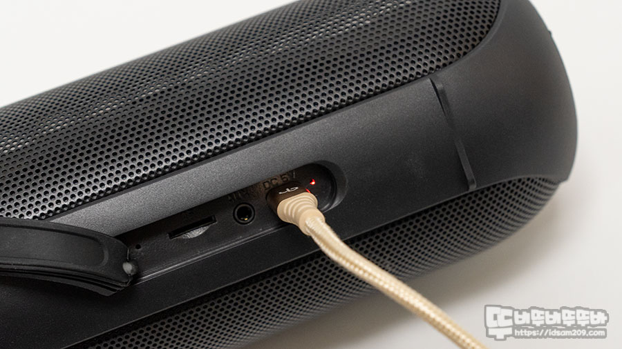 바닥면에는 IPX7 방수를 지원하는 제품답게 실리콘 소재 커버를 사용하고 있어 충전, AUX 입력, MIcroSD 메모리 카드 슬롯, USB-C 전원 단자 등의 I/O 포트에 물이 스며들지 않게 보호하고 있으니 사용 후 꼭 막아두세요.