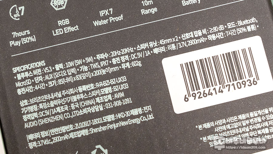 패키지 뒷면에는 포인트 제품 정보를 확인할 수 있는데 블루투스 5.3, 10W 출력, 45mm 듀얼 드라이버, MicroSD/AUX in 지원, Type-c 충전 포트, 7시간 재생, RGB LED 효과, IPX7 워터프루프, 2900mAh, 3000mAh 배터리, 두 개 제품을 사용한다면 TWS 기능으로 사용이 가능하다는 내용이 인쇄되어 있는데요.