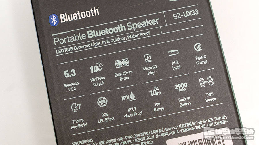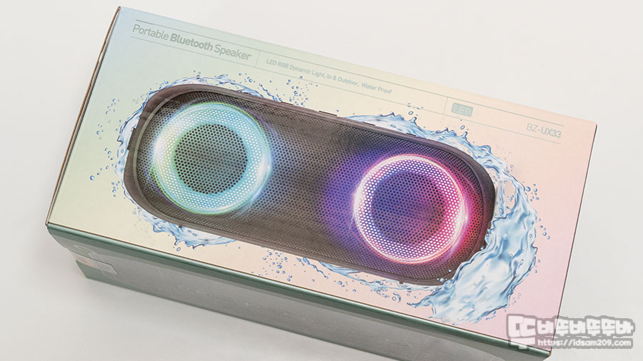 패키지에는 제품의 모델명 BZ-UX33 포터블 스피커 디자인에 LED 효과 그리고 IPX7 워터프루프를 지원하는 이미지로 이 제품이 어떤 특징이 있는지 한눈에 알 수 있었습니다.