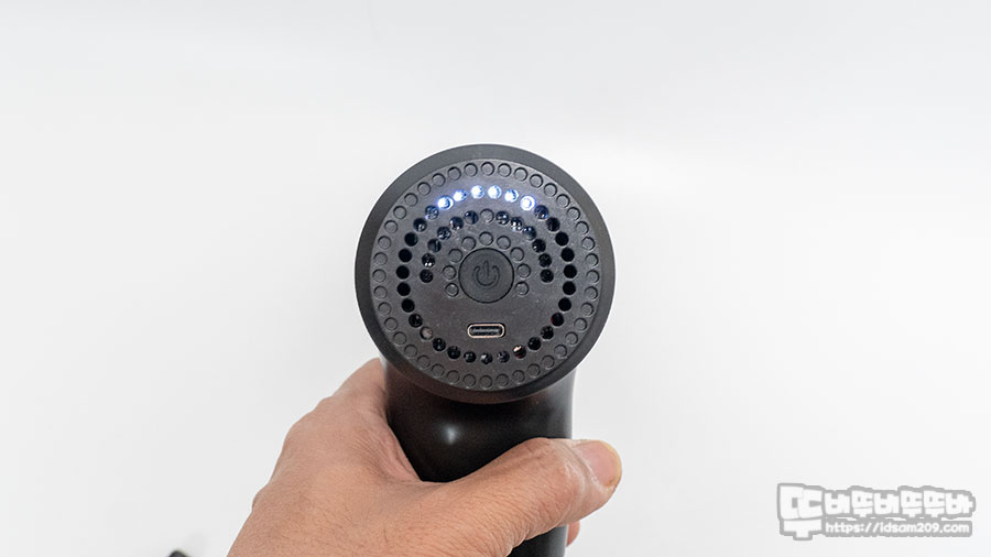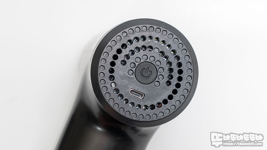 마사지 건을 충전할 때엔 충전 단자 밑으로 Red LED 인디케이터로 충전 중임을 확인할 수 있으며 완충 시 Green LED로 표현되고요.