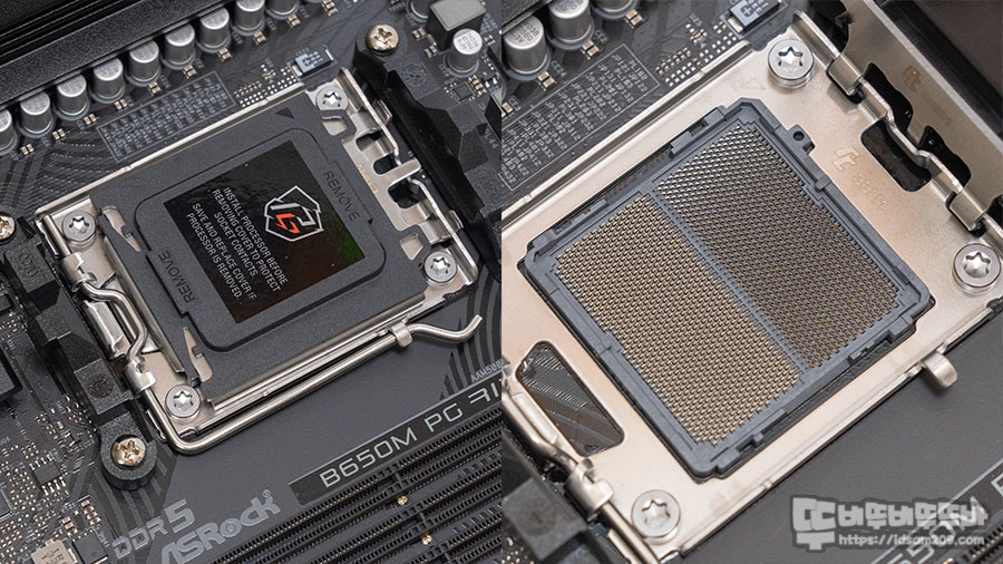 이전에 AM4 (PGA방식) 소켓에서는 쿨러를 교체할 때 CPU가 쿨러에 붙어 뽑히는 무뽑기를 경험했지만 AM5로 넘어오면서 인텔과 동일한 LGA방식의 소켓을 사용하여 드디어 무뽑기에서 졸업하게 되었네요.