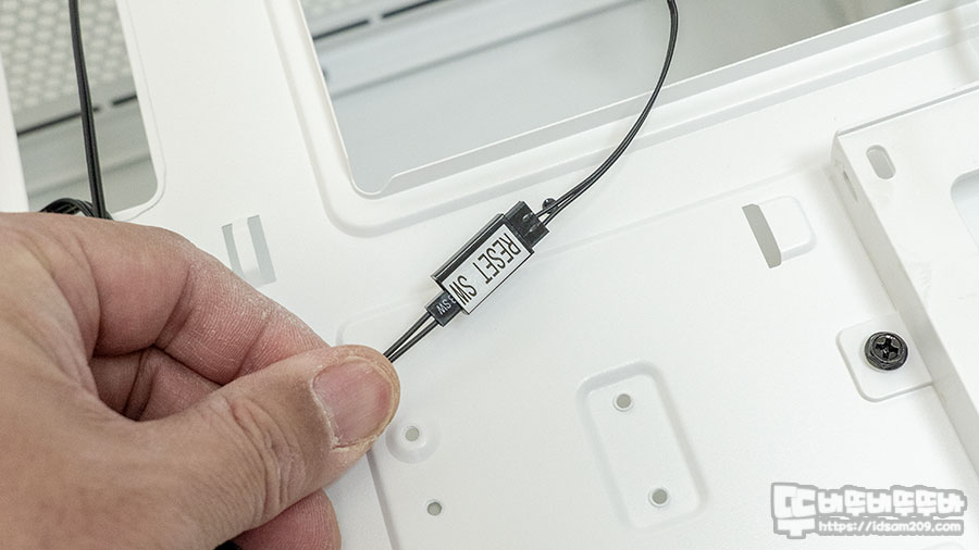 이전에는 케이스 후면 쿨링팬에 전면의 리셋 커넥터를 연결하여 리셋 버튼을 LED 컨트롤 기능으로 사용하였지만 다크플래쉬 DS900는 추가 케이블로 구성한 LED 버튼 그리고 리셋 버튼이 각각 사용되기에 사진과 같이 연결된 케이블은 리셋이 아닌 LED 컨트롤 커넥터이니 분리하지 마세요.