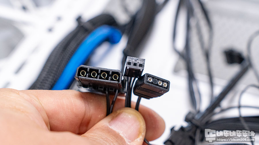 케이스의 LED 효과를 위해서 꼭 연결해야 하는 핵심 커넥터는 왼쪽부터 IDE 4핀 (전원), 쿨링팬 3핀 (시스템 팬), 5V ARGB 커넥터는 메인이 되는 케이스 후면 팬을 통해 연결된 케이스의 모두 쿨러의 쿨링팬의 전원, RPM 제어, ARGB까지 모두 제어를 담당하게 됩니다.