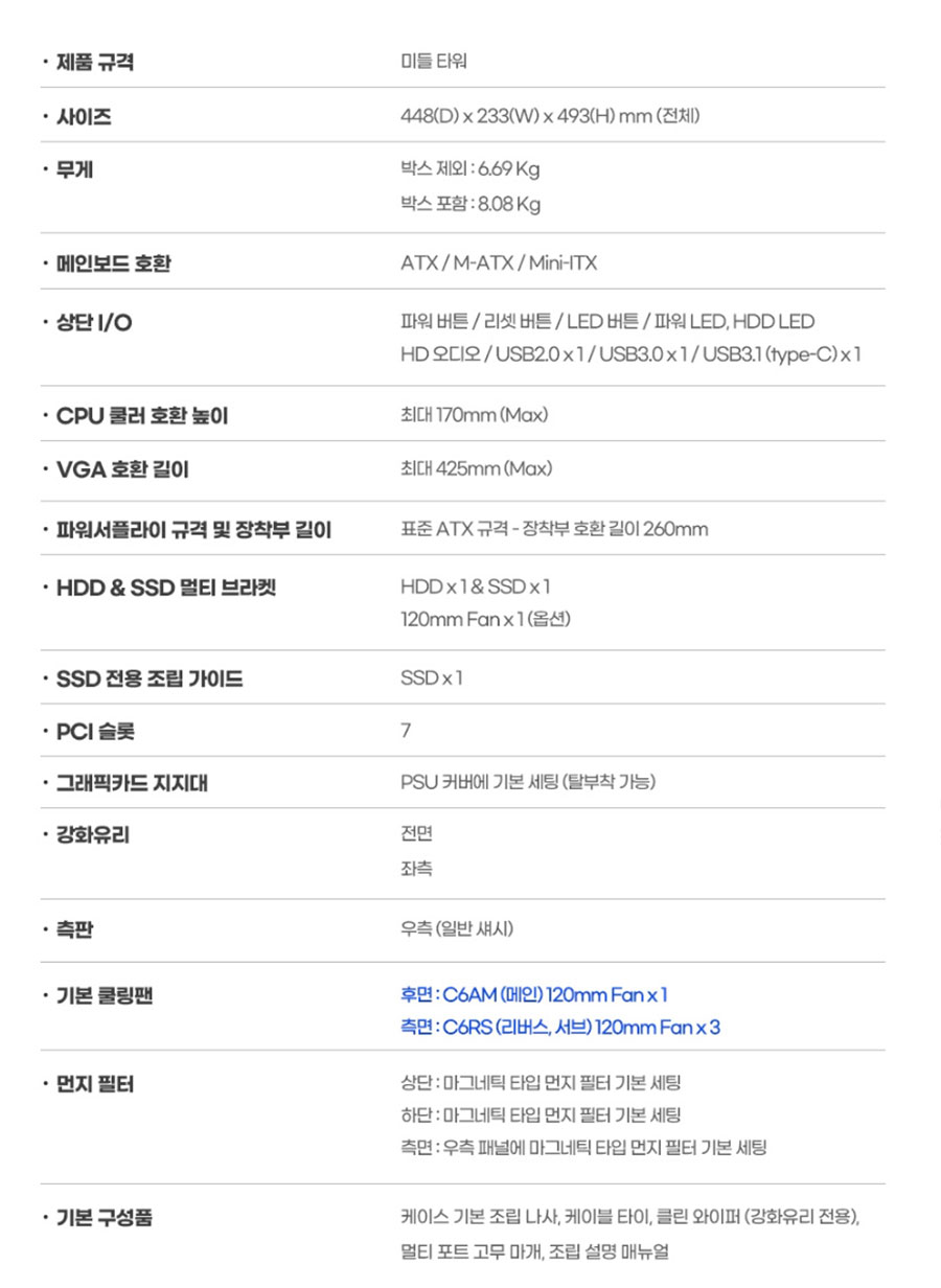 2면 강화유리, 후면 팬 스틸 메쉬 가이드 적용, VGA 길이 425mm 수용, 120mm 팬 1개 장착 가능, 360mm 3열 수랭쿨러 지원, LED 버튼 / USB 3.0 x 1 / USB 2.0 x 1 / Type-c x 1 전면 I/O 포트 지원 등의 정보를 강조하고 있습니다.