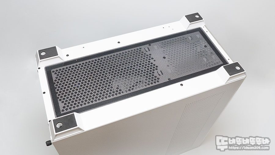 기존의 케이스와 다른 darkFlash DS900만의 특징이라면 케이스의 쿨링팬 장착부를 타공이 아닌 오픈 형태에 그릴을 사용하고 있어 기존 타공 형태보다 공기 흐름을 개선하였네요.