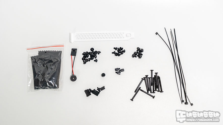 먼저 시스템 빌드에 앞서 제공되는 부자재를 살펴보면 메인보드/SSD 장착용 둥근 접시나사, HDD 장착용 둥근헤드 나사, 파워서플라이 장착/VGA 장착용 육각헤드 나사, 메인보드 고정용 육각 스탠드오프, 스탠드오프 전용 툴, 전면포트 고무마개, 수랭쿨러 고정용 긴나사, 여분의 케이블 타이, 메인보드 부저, PCI슬롯 커버, 강화유리 패널용 클리너 등으로 구성되어 있고요.
