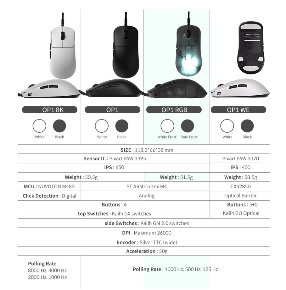 엔드게임기어에서 출시한 새로운 유선 마우스인 OP1 모델은 이전에 출시한 무선 모델인 OP1we의 유선 모델로 일반 모델, RGB 라이팅 지원 모델, 8K 폴링 레이트 지원 모델 3가지로 출시하여 유저들의 취향에 맞게 선택이 가능한데요.
