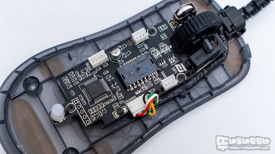 사이드 버튼과 메인 버튼으로 연결되는 모든 부분은 소켓을 사용하고 있어 그런지 메인 PCB가 보통의 마우스 PCB에 비해 작은 편입니다.