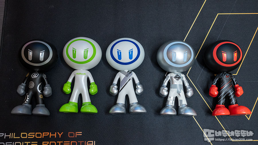 캐릭터 인형을 살펴보면 ASROCK 메인보드 라인업인 타이치, ASROCK, PRO, 스틸레전드, 펜텀 게이밍 순으로 메인보드의 로고와 컬러를 반영하고 있네요.