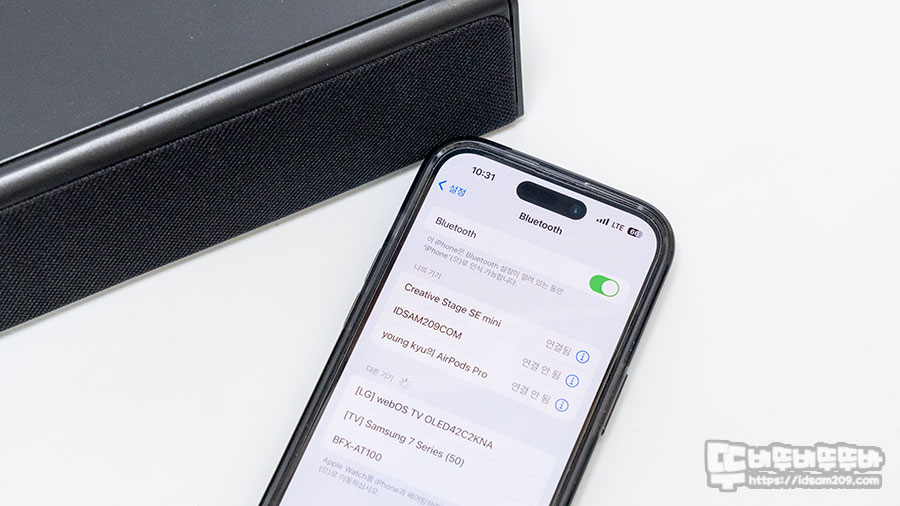 블루투스 페어링 모드 시 스마트폰 블루투스 기기 리스트에 등장하는 Creative STAGE SE를 선택하면 페어링이 완료되며 최초 페어링 이후에는 오토 페어링으로 사용되기에 블루투스 모드를 선택하면 자동으로 스마트폰과 연결되고요.