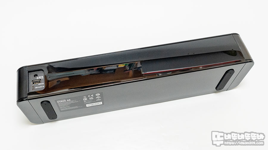 Creative STAGE SE는 410 X 108 X 68mm 크기로 mini 제품보다 앞뒤로 두껍고 살짝 높은 게 특징이며 USB 전원이 아닌 DC 15V 2A 전원을 사용하며 12W 출력의 스피커 2개 구성으로 RMS 24W 최대 피크 출력 48W를 지원하는데요.