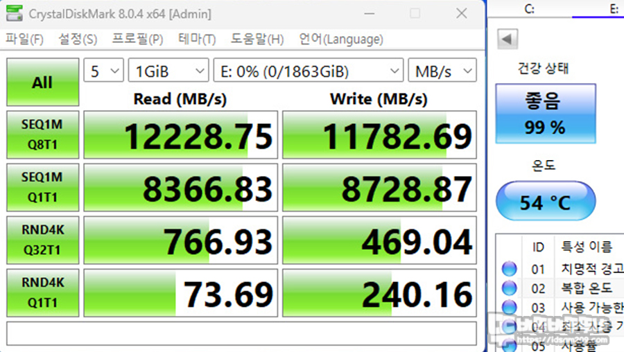 확실히 히트싱크와 쿨링팬 조합 시 PCIe 5.0 M.2 SSD를 사용하때 54도가 최고 온도로 보여주었습니다.
