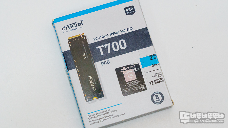 테스트에 사용된 PCIe 5.0 M.2 SSD는 마이크론 크루셜 T700 모델로 순차읽기: 12,400MB/s / 순차쓰기: 11,800MB/s 속도를 지원하는 특징이 있습니다.