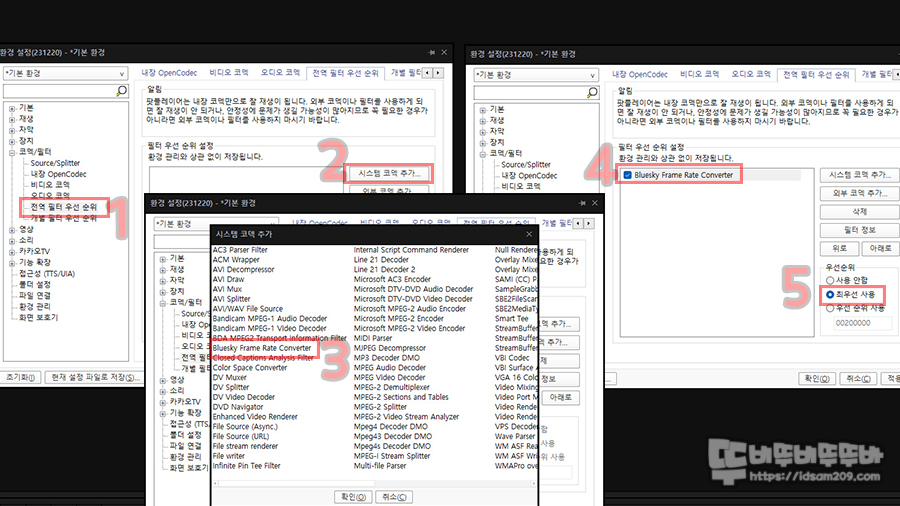 이후에는 팟플레이어를 실행 - F5 - 전역 필터 우선순위 선택 - 시스템 코텍 추가 - Bluesky Frame Rate Converter 선택 - 최우선 사용을 선택하여 적용하면 모든 설정이 끝납니다.