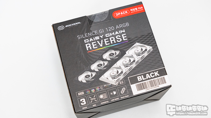 3RSYS Silence GI 120 리버스 3팩 쿨러는 블랙/화이트 모델로 판매되는데 필자가 리뷰하는 제품은 블랙 제품으로 패키지 전면에 Black 컬러가 크게 인쇄된 것을 확인할 수 있습니다.