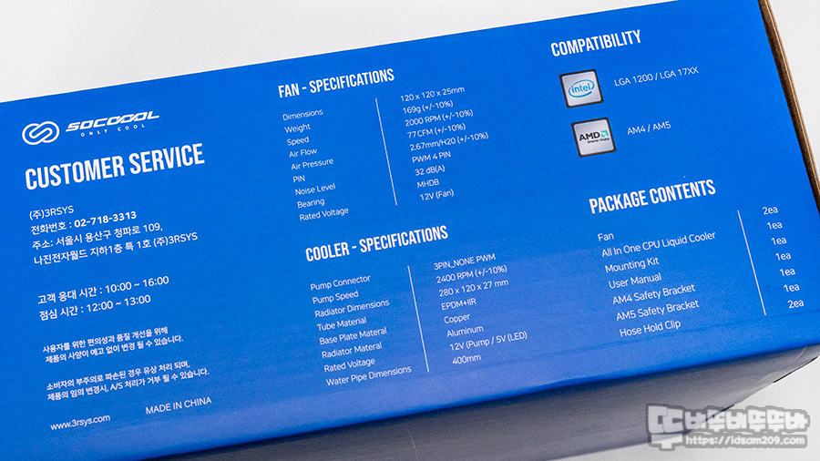3RSYS Socoool 라니 SE 240 ARGB 10만 원대 판매되는 2열 수랭 쿨러 제품으로 최신 인텔 CPU 및 AMD AM4 무뽑기 방지 가이드 및 AM5용 가이드까지 제공되기에 어느 브랜드 CPU를 선택하더라고 편리하게 조립이 가능합니다.