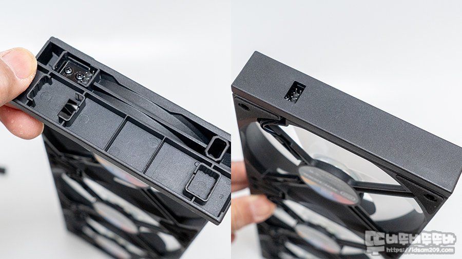 쿨링팬에 케이블이 없는 데이지 체인 방식으로 쿨러 양쪽에 각각의 쿨러를 연결하는 In/Out 연결핀과 소켓 그리고 옆에는 쿨러를 고정하는 가이드 홀로 디자인되어 꽤 든든하게 연결됩니다.