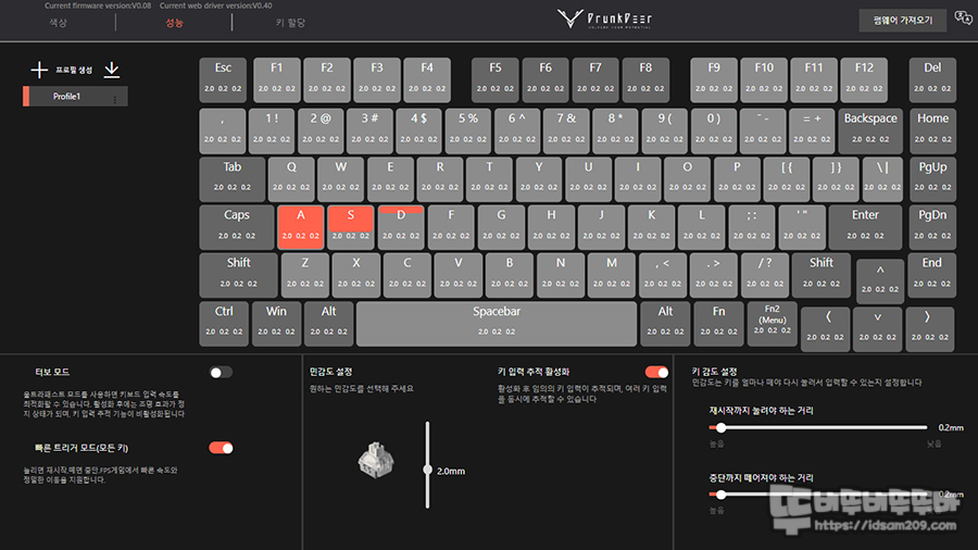 일단 메뉴 하단부 왼쪽에는 터보 모드와 레피드 트리거 기능을 선택하는 메뉴 구성 중앙 부분에 직관적으로 0.2mm ~ 3.8mm 사이의 입력 지점을 마우스 드래그로 선택할 수 있으며 키 입력 추적 활성화 시 키에 입력되는 압력 지점을 시각적으로 확인이 가능합니다.