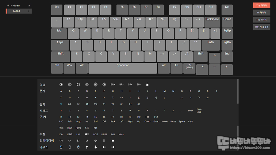 기본 배열을 사용하지 않고 사용자가 원하는 키 레이어를 사용할 수 있는 2개의 레이어를 제공하는 게 특징입니다.