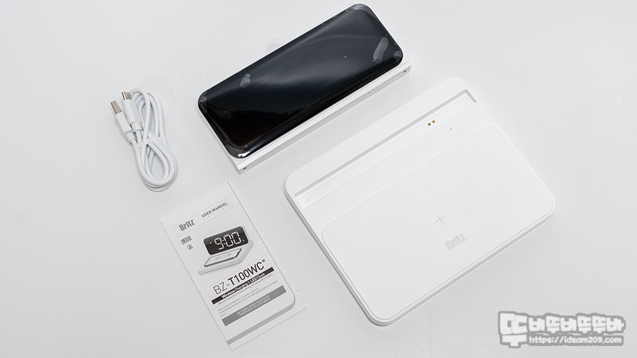 제품은 무선 충전기, LED 디스플레이, USB-C to A 케이블, 매뉴얼로 구성되었으며 대부분의 무선 충전기 제품과 동일하게 고속 충전 아답터는 제공되지 않으니 참고하시기 바랍니다.
