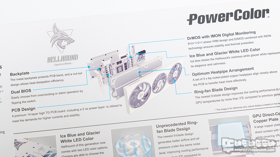 PowerColor 라데온 RX 7800 XT Hellhound Spectral White D6 16GB를 살펴보면 제법 사이즈가 있는 3 팬 쿨러가 적용된 모델로 이전 모델들은 쿨러 크기에 비해 작은 기판이 적용되었다면 7800XT는 기판도 나름 큰 사이즈로 설계되었네요.