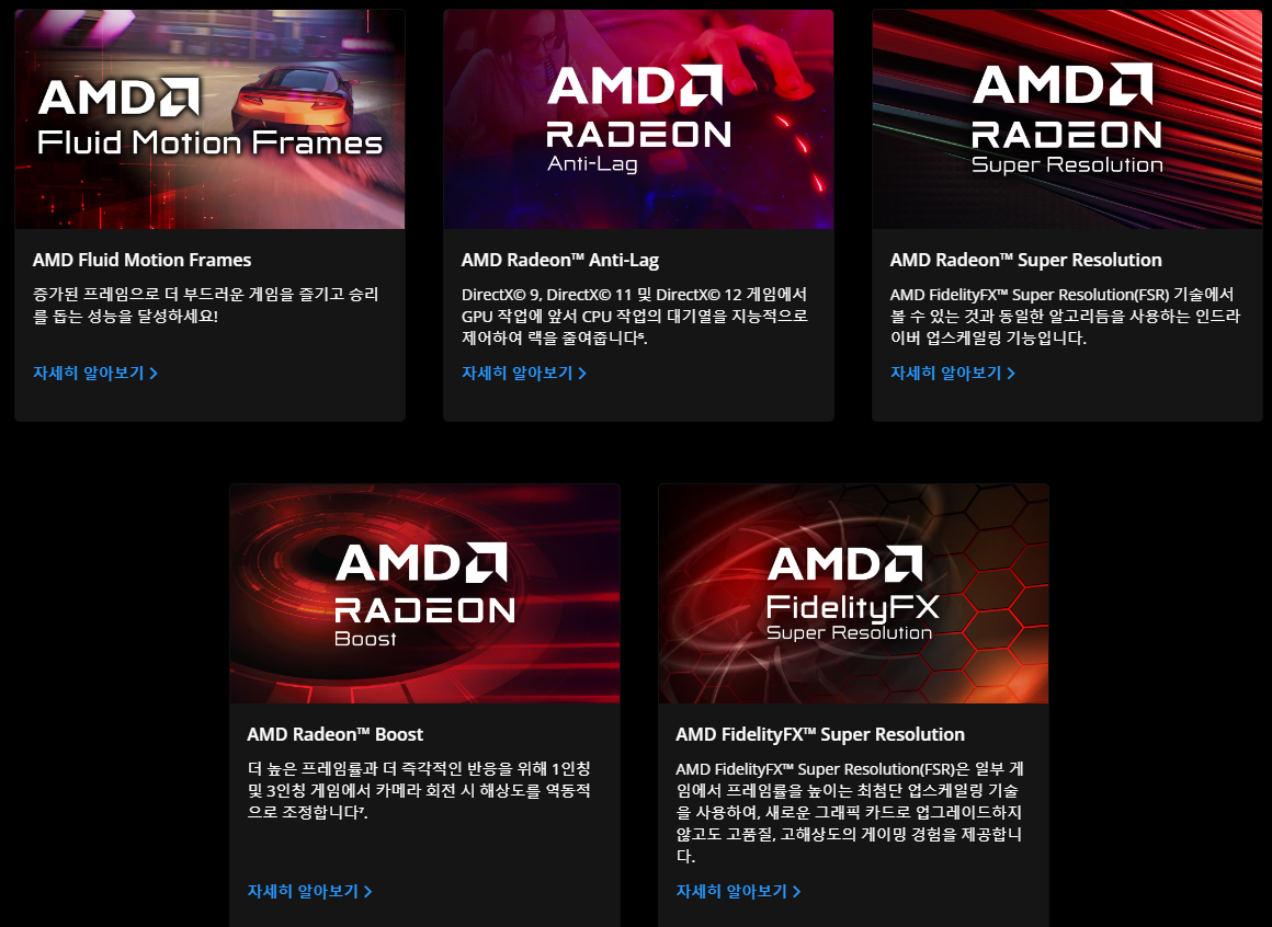 Super Resolution(업 스케일링), Anti-Lag(지연 감소), Boost(동적 해상도 조정) 기능에 프레임을 추가해 주는 AMD Fluid Motion Frames(AFMF) 등의 기술을 클릭 한 번으로 최적화된 설정을 사용할 수 있습니다.