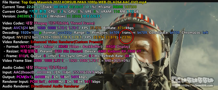 Bluesky Frame Rate Converter를 다운받은 후 곰플레이 시스템 코덱 추가 후 전역 필터 우선순위로 설정해 주고 영상을 재생하면 23 프레임으로 재생되는 영상이 47 프레임으로 상승하여 부드럽게 재생되는 것을 확인할 수 있습니다.