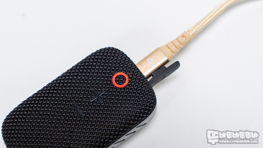 IPX5를 지원하는 제품이기에 제품 상단에는 충전 단자가 실리콘 캡으로 덮여 있으며 그 옆에는 마이크 홀을 확인할 수 있습니다.