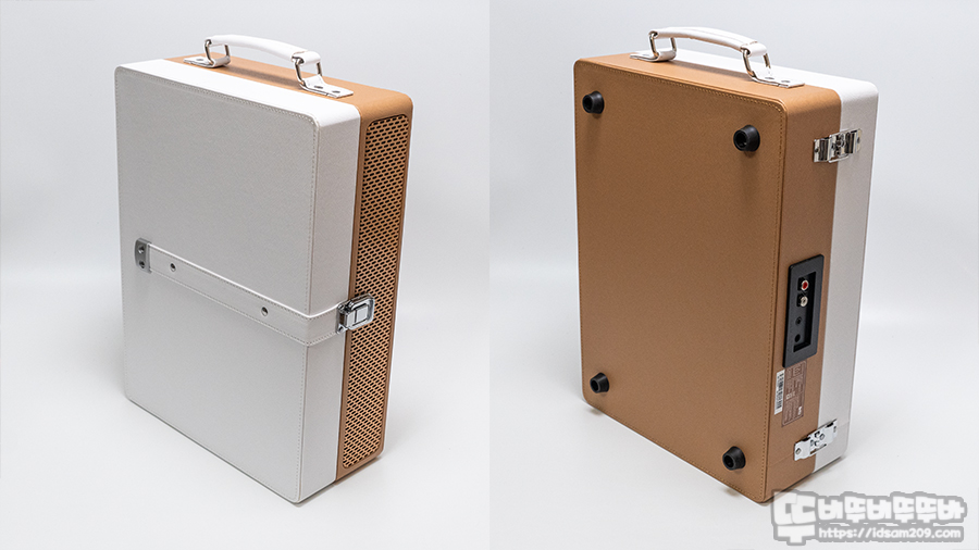 브리츠 BZ-TP4000은 MDF 베이스에 인조가죽을 사용한 휴대용 가방 형태로 디자인되어 꽤 심플한데 인조가죽으로 사용하고 있어 표면의 이염 또는 오염이 발생할 수 있지만 그런 상황이 온다면 빈티지 느낌을 줄 거 같습니다.