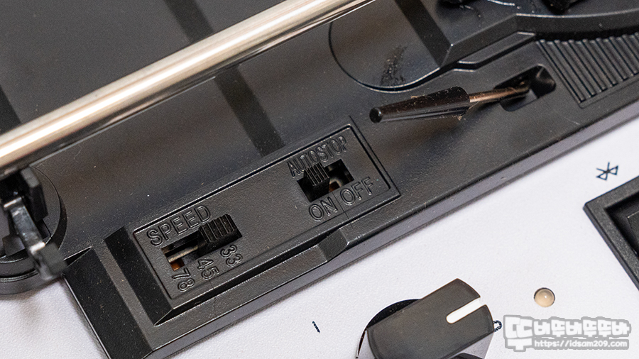 톤암 주변에 33 / 45 / 78 등 rpm을 3단계로 조절이 가능한 스위치와 AutoStop On/Off 스위치 그리고 3.5mm 헤드폰 단자, 전원 On/Off 겸 볼륨 조절이 가능한 토클 스위치, 미세 속도(Pitch) 조절 다이얼, 작동 상태를 알려주는 LED 인디케이터, 내장 스피커로 소리를 들려주는 Phono 모드, Phono 출력을 블루투스로 전송하는 모드, 블루투스 수신으로 외부 기기의 소리를 들려주는 블루투스 스피커 모드로 사용이 가능하며 후면에 Aux in으로 소리가 입력될 때엔 입력 모드 스위치 작동이 불가능한 점을 참고하시기 바랍니다.