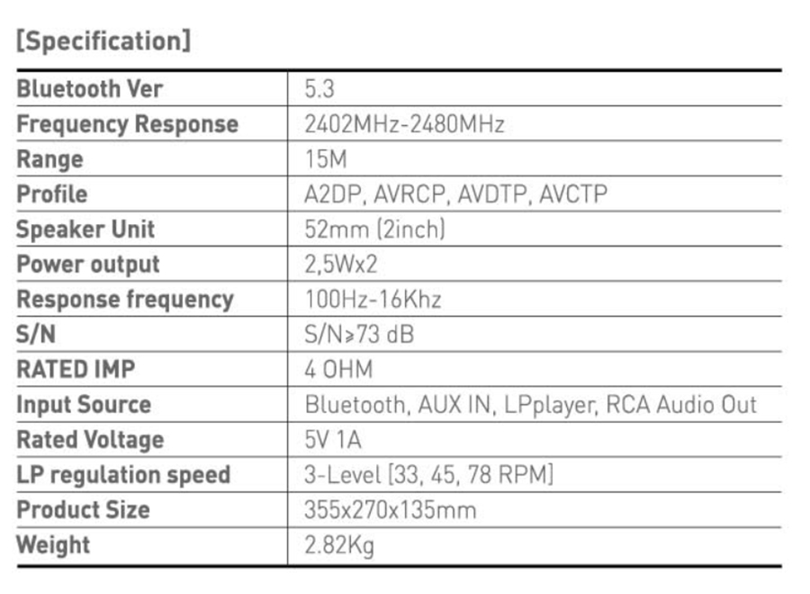블루투스 5.3 / 턴테이블 / RCA 출력 / 3.5mm AUX 입력 / 52mm X 2 드라이버 유닛 / 33, 44, 78 3단계 속도 지원 / 레트로 백 타입 / MDF 인클저 / 블루투스 사용 시 15m 거리 가능 / 오토 스톱 기능 지원 등의 내용을 확인할 수 있습니다.