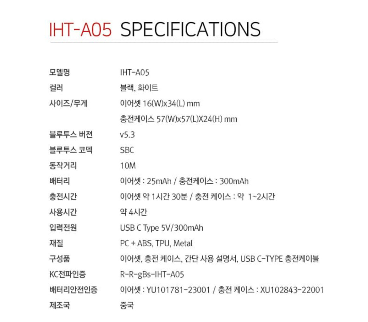 최초 충전 케이스에 이어버드를 꺼내면 자동으로 페어링 모드로 진입하며 스마트폰 블루투스 기기 리스트에 등장하는 IHT-A05를 선택하여 페어링이 완료되며 최초 페어링 이후에는 이어버드만 꺼내도 오토 페어링으로 편리하게 사용할 수 있습니다.