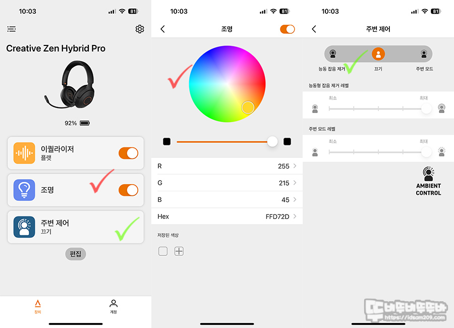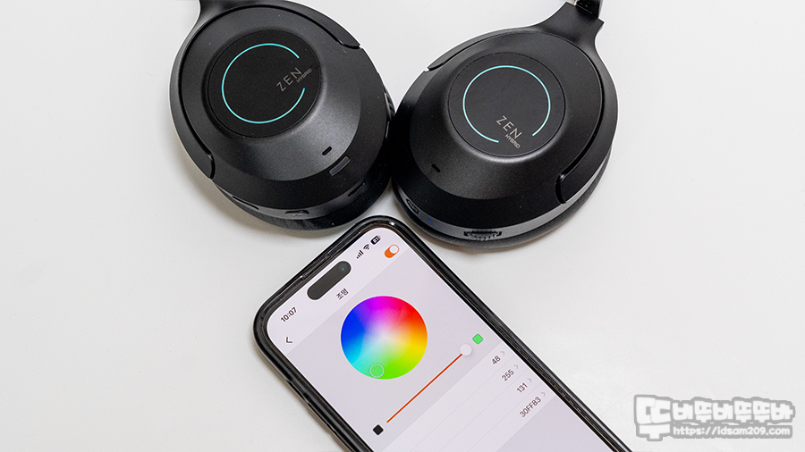 RGB 효과의 원형으로 표현되는 팔레트에서 직관적으로 컬러를 선택하거나 R, G, B, HEX 코드로 취향에 맞는 컬러 적용이 가능하고 주변 제어 메뉴를 통해서 ANC On/Off, 주변소리 듣기(Ambient) 선택 및 해당 기능의 레벨을 디테일하게 설정하여 사용할 수 있으며 특히 RGB 컬러의 경우 LED로 표현되기에 100% 일치되는 컬러로 표현되기보다 약간 물 빠진 컬러로 보일 수 있다는 점 참고하시기 바랍니다.