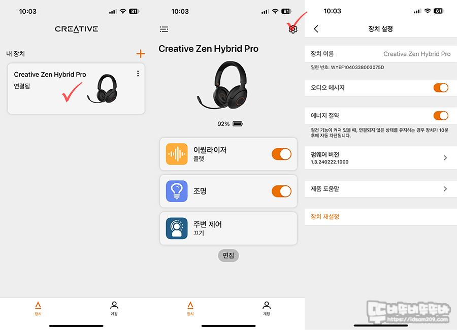 보통 앱을 이용한 EQ를 지원하는 제품을 사용해 보면 음의 변화가 밋밋해서 변화가 크게 체감되지 않는데 Creative 크리에이티브 ZEN HYBRID PRO LC3+ 블루투스 헤드폰은 음의 변화가 확확 변화되어 체감이 되니 취향 저격으로 설정할 수 있었습니다.