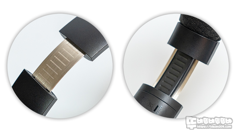 헤어밴드의 길이 조절 부분은 바깥쪽은 메탈 안쪽으로 플라스틱 2중으로 설계되어 안정적인 텐션으로 착용 시 좌우 늘림이 가능하며 안쪽의 플라스틱 부분에 "다 다 닥" 걸리는 소리를 들려주기에 착용하기 전 또는 착용 후 좌우 균형을 맞출 수 있고요.