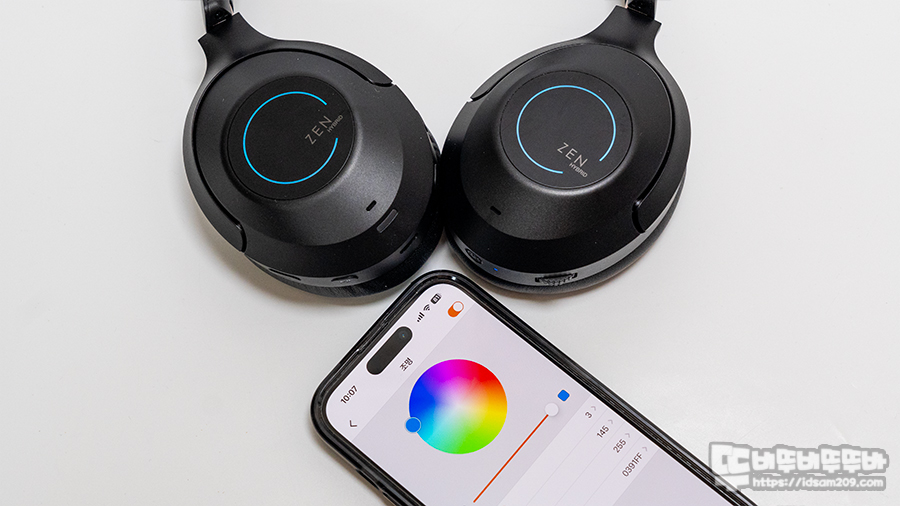 양쪽 이어컵 바깥쪽은 전용 앱을 사용했을 때 LED 효과를 표현하는 원형 디퓨저와 Zen Hybrid 로고 그리고 아래쪽에 액티브 노이즈 캔슬링과 앰비언트 모드를 위한 마이크 홀의 모습을 확인할 수 있습니다.